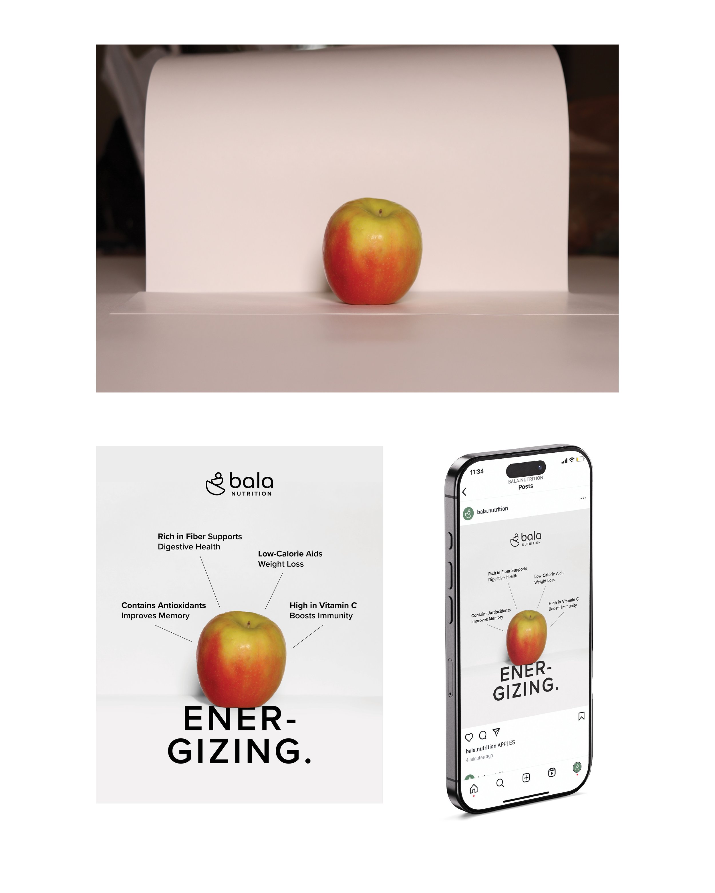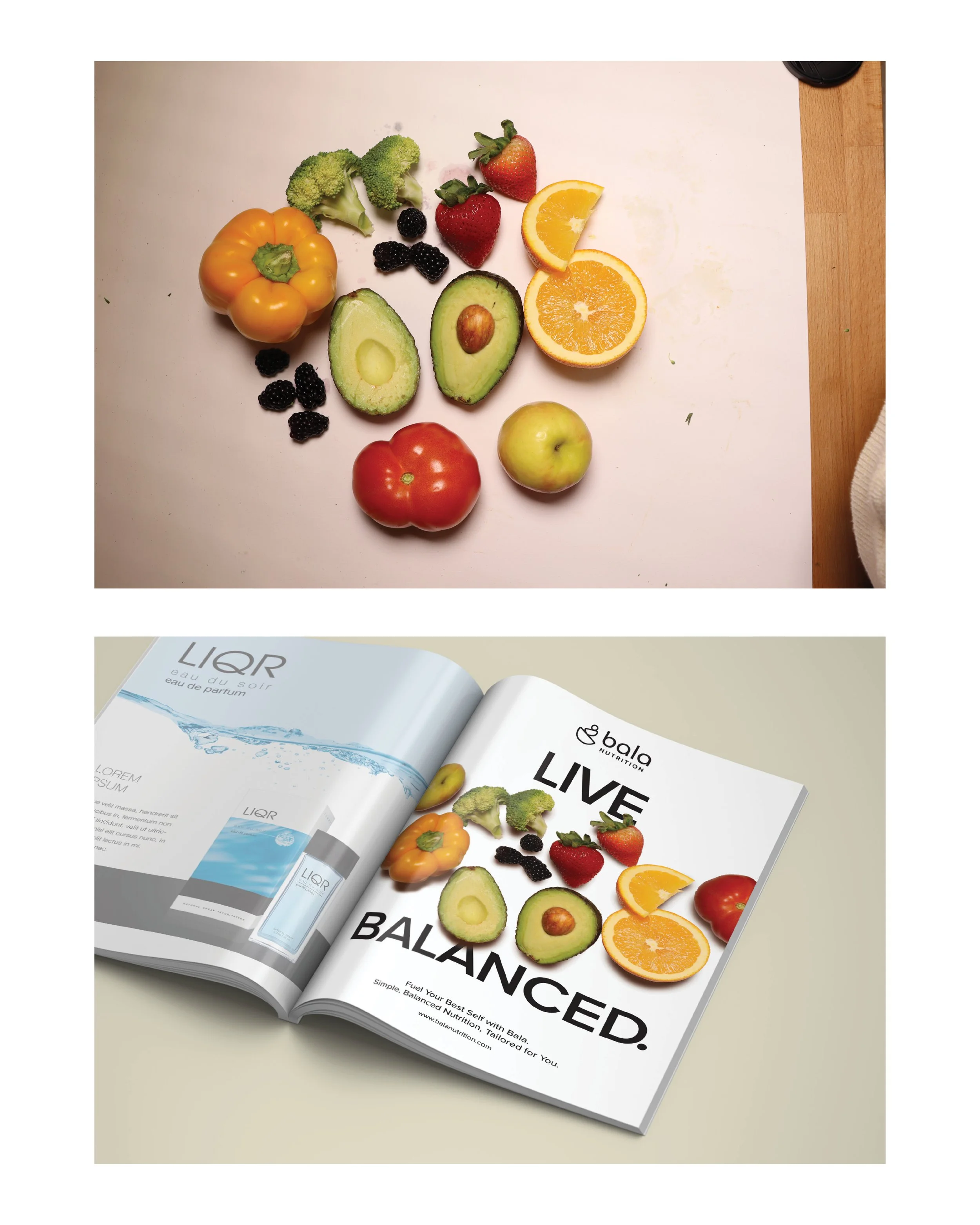 The logo system features a clean and modern sans-serif paired with an icon that represents balanced nutrition. Along with a logo system, we had to create various deliverables: a billboard, website, social media graphics, vehicle wrap, business cards, magazine spreads, and informative cards for each food group. Another aspect of Bala branding is bright, clean food photography that I took myself for the magazine spread, billboard, and vehicle wrap.