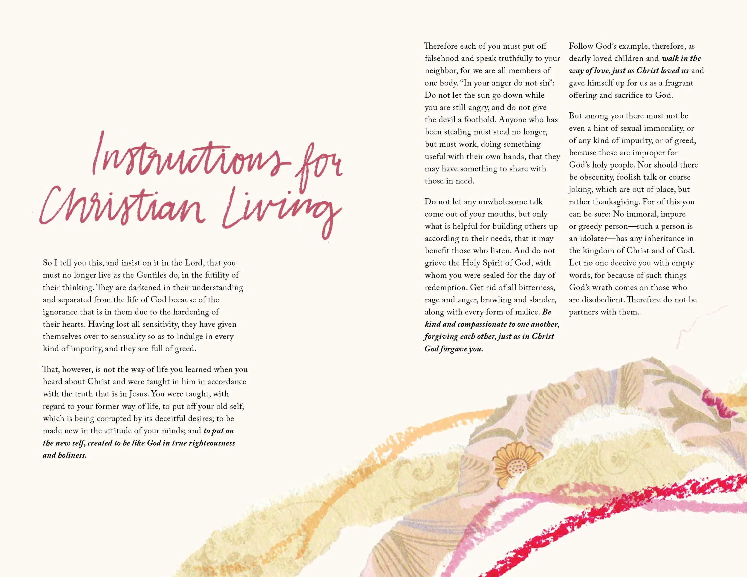 The Ephesians Booklet is a reimagined edition of Scripture designed to present Paul’s letter as it was originally written, with chapter and verse markers removed to create an uninterrupted reading experience. Styled as a mini coffee-table book, it functions as both a visual art piece and a contemplative object, inviting readers to slow down, sit with the text, and engage more deeply with this message of encouragement and unity.