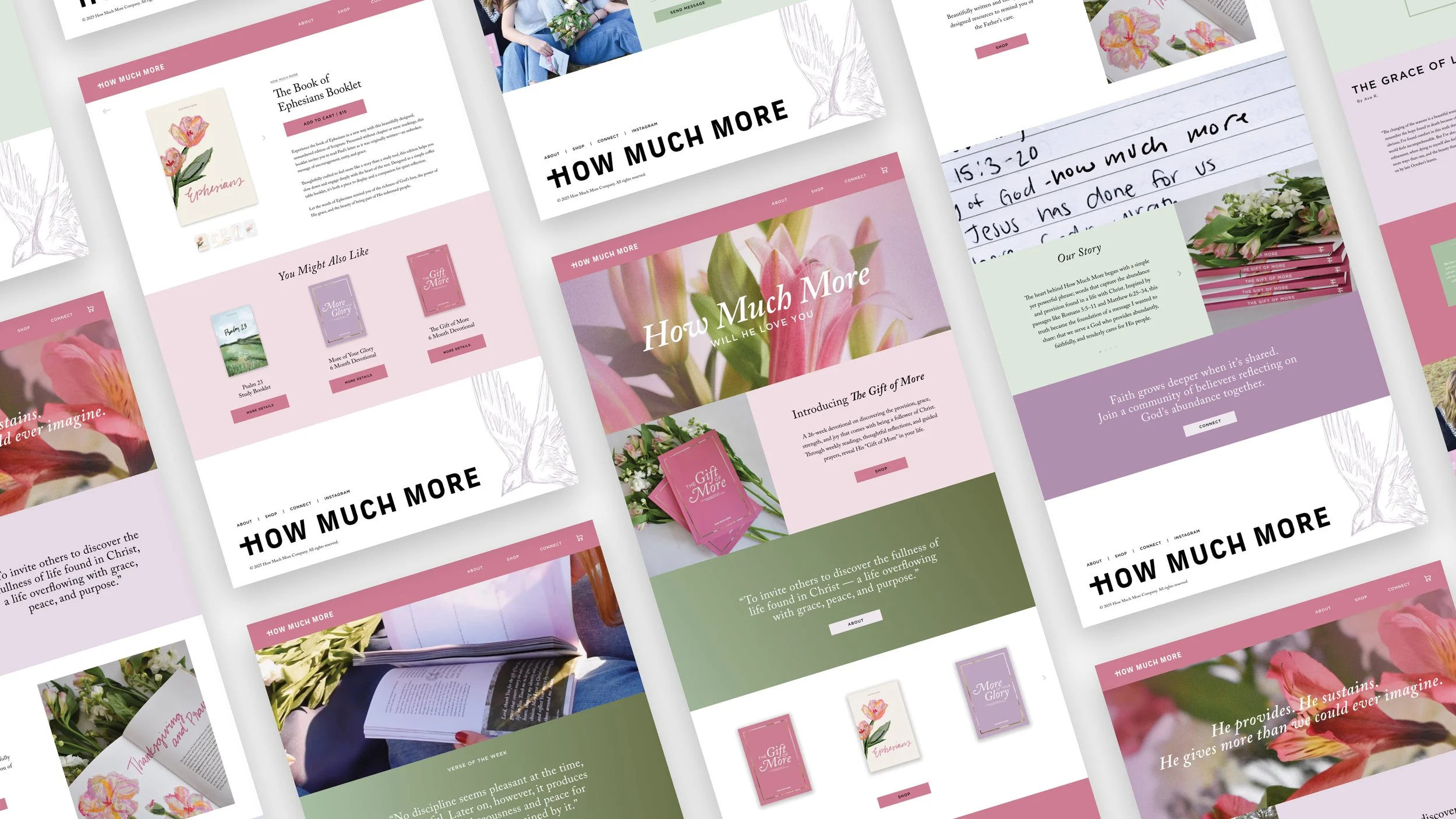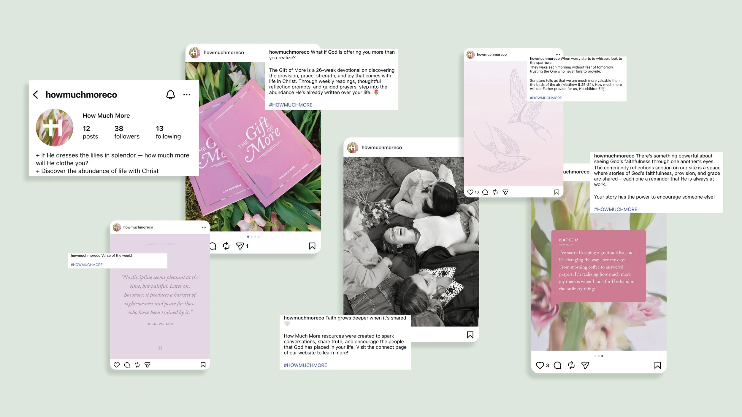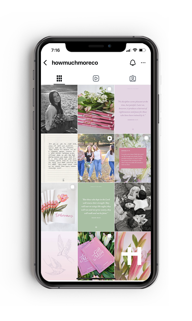 The How Much More Instagram presence is designed to foster interaction rather than simply promote products. It invites the community in through personal stories, “Verse of the Week” posts, video content, and behind-the-scenes brand insights. The feed fully embraces the brand color palette while balancing product and lifestyle photography with clean, minimal graphics.