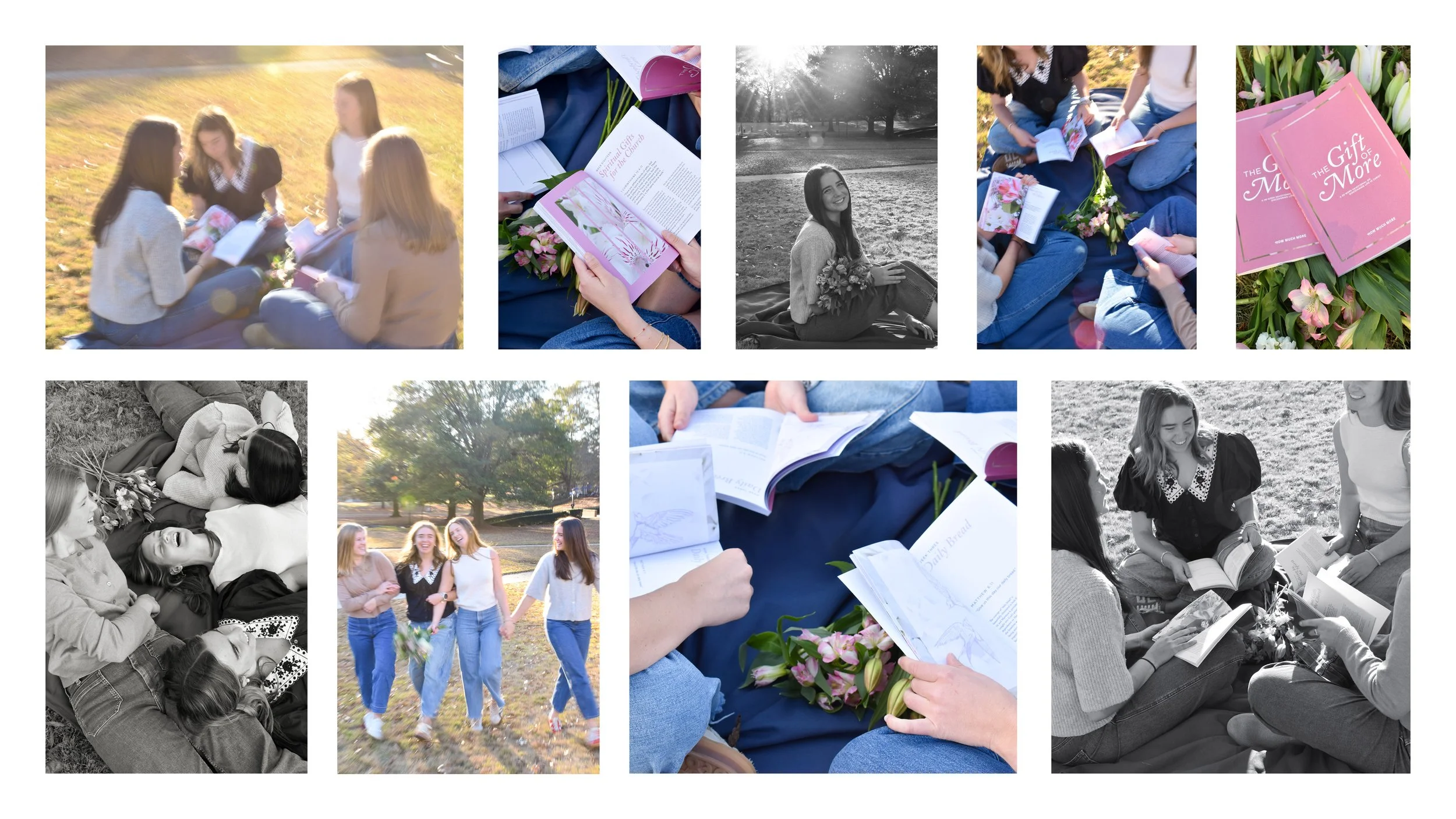 The floral photography is a mixture of bright, clear images and blurred for more abstract uses. Monotone, blur, color, and grain add texture and depth. Lifestyle photography also features motion blur that feels real and raw, capturing true moments of young women enjoying the products and finding community through How Much More.