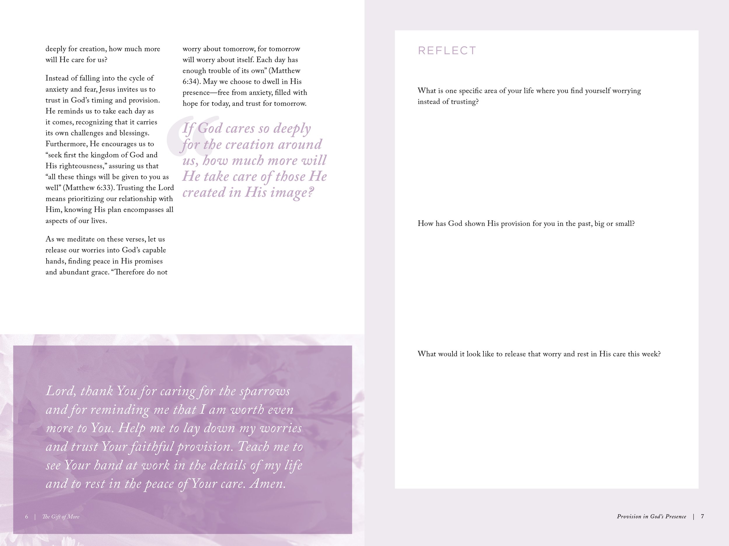 The Gift of More is a 6-month, 116-page devotional centered on discovering life in Christ throughout four themes— Provision in God’s Presence, Abundance of Grace, Strength in the Spirit, and Overflowing Hope and Joy. Readers experience weekly readings, guided prayers, and thoughtful reflection questions and journaling prompts that allow true encounters with Christ.